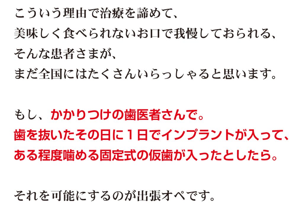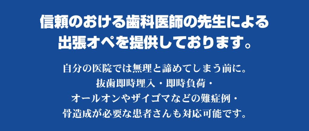 私どもがご提案するインプラント出張オペは、これまで遠方に行かなければ治療が難しかった患者さまの負担軽減もさることながら、オペを実施する医院さまにもメリットがあると考えております。